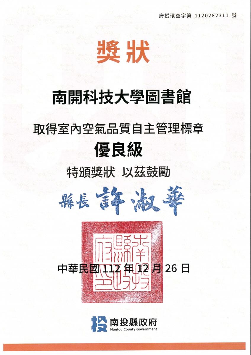 NKUT新聞園地第320期 瀏覽人次186【總務處訊】南開科技大學取得室內空氣品質自主管理標章,112年被評選為南投縣優良級標章場域,112年12月26日接受南投縣政府環境保護局頒獎,也是對本校在室內空氣品質管理方面採取積極措施的肯定,證明本校建築物室內在通風、空氣淨化、室內空氣質量監測等方面採取了有效措施,確保室內空氣清潔、健康。優良級標章場域的獲得有助於提高師生對本校的室內空氣品質信任度,並鼓勵鄰近學校一起提升室內空氣品質管理水準。(2023/12/28)